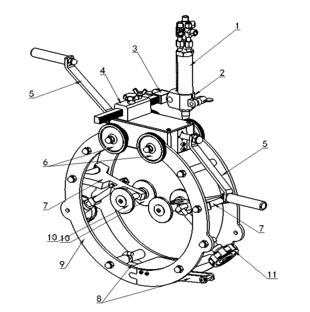 6.驅(qū)動輪 7.夾緊裝置 8.鎖緊裝置 9.圓形導(dǎo)軌 10.夾緊輪