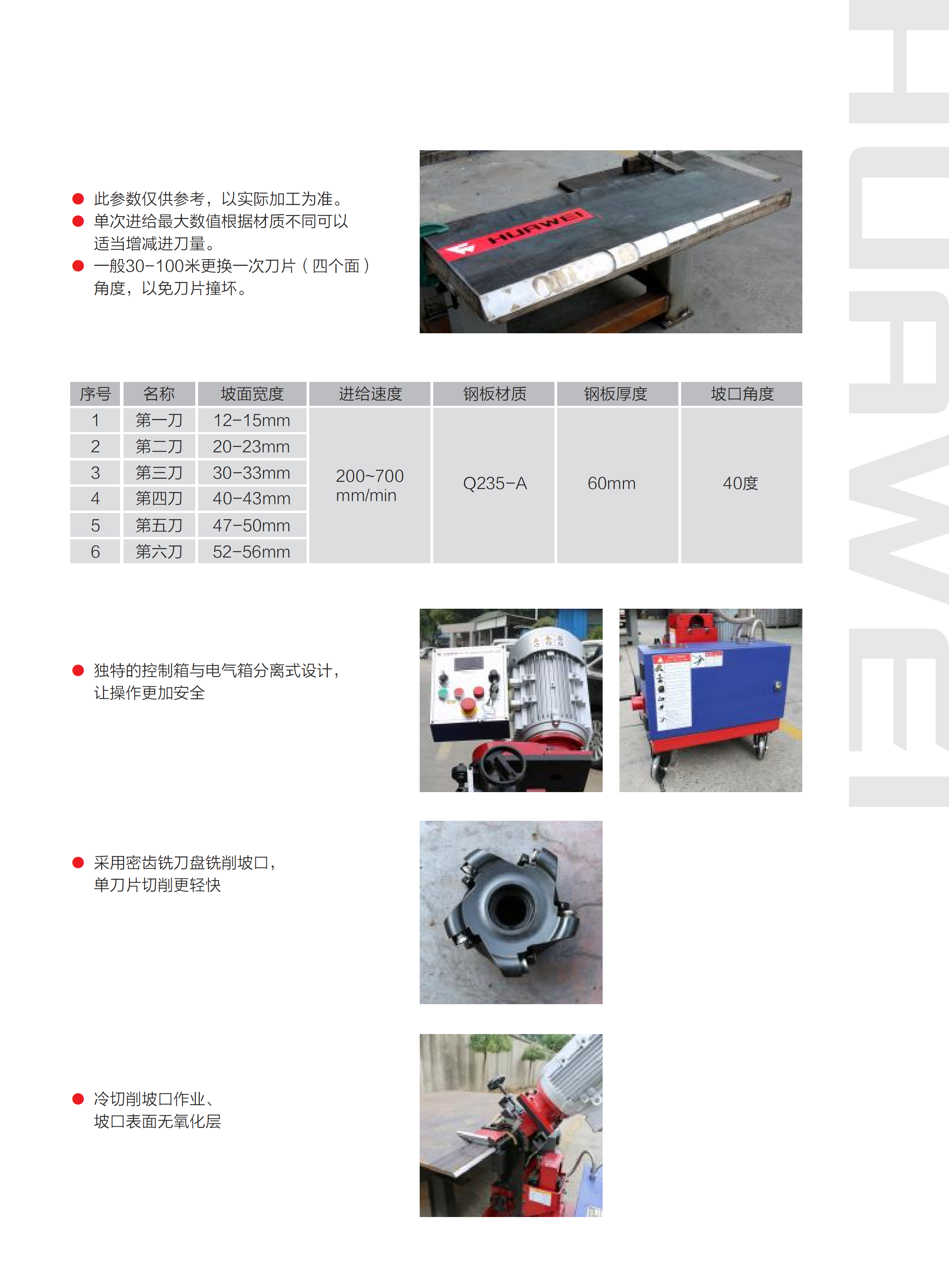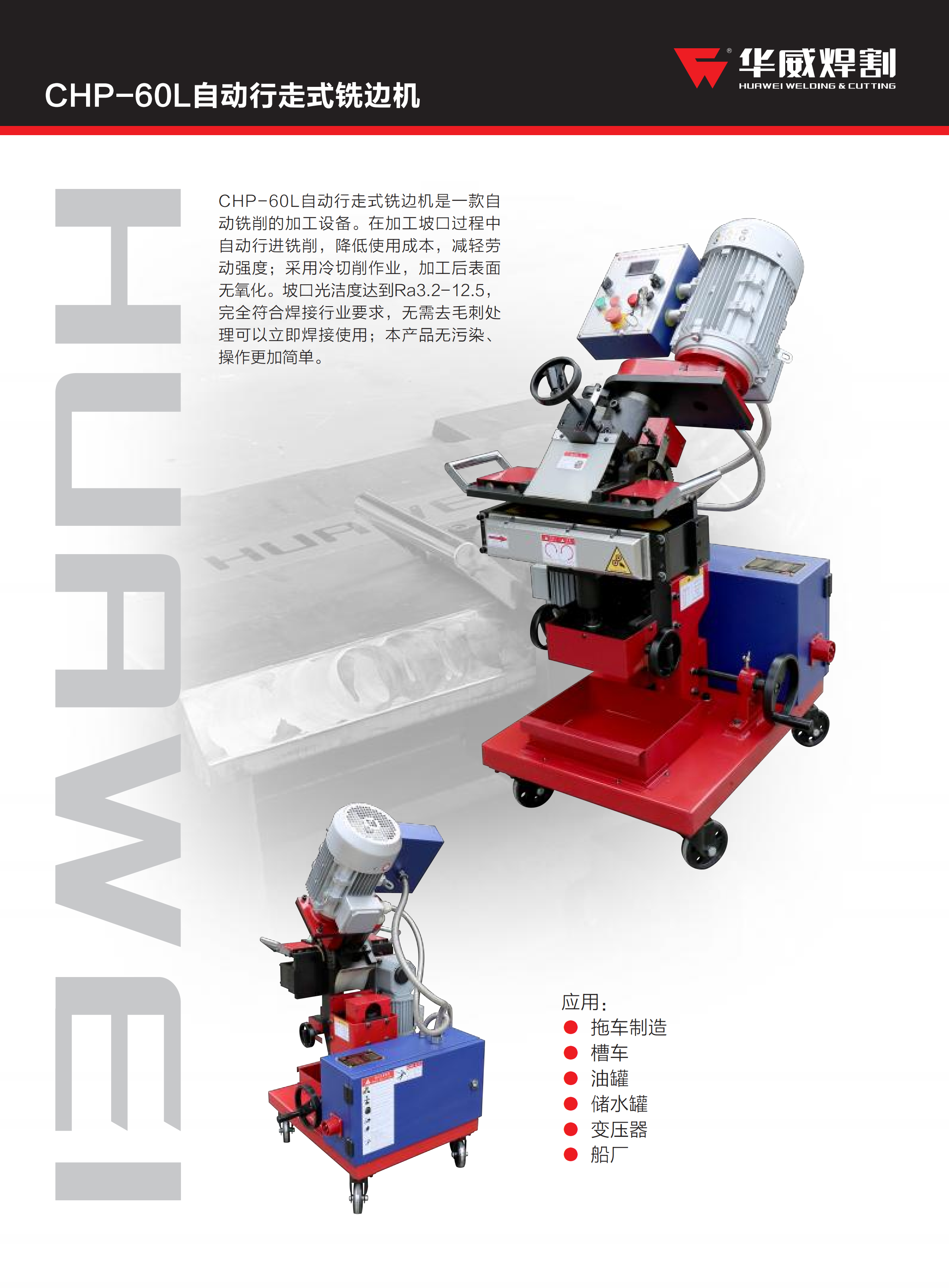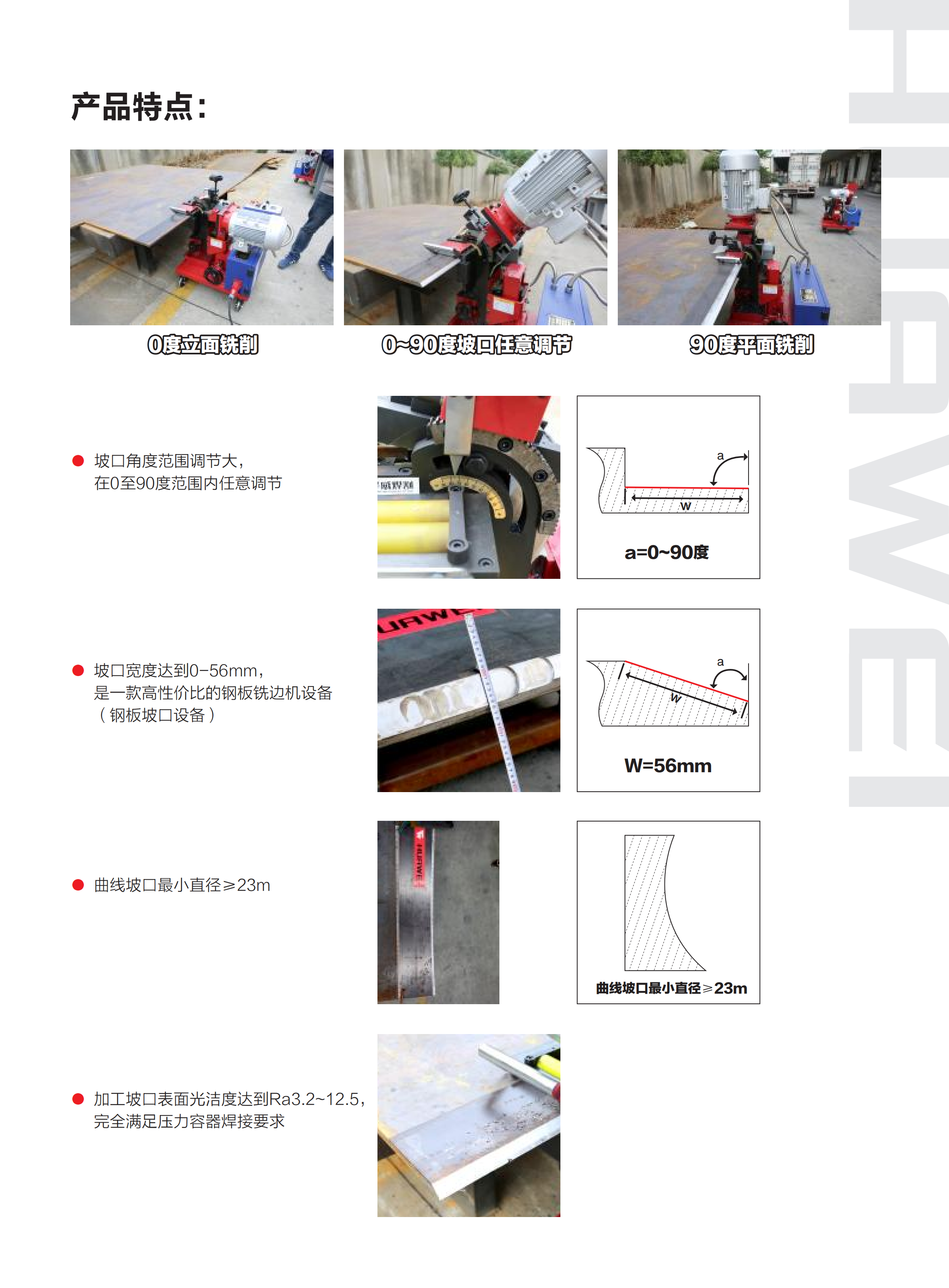 本產(chǎn)品是一款自動(dòng)行進(jìn)式銑邊設(shè)備,加工坡口過(guò)程中自動(dòng)行進(jìn)銑削,降低使用成本,減輕勞動(dòng)強(qiáng)度,采用冷切削作業(yè),加工后的坡口表面無(wú)氧化。坡口表面光潔度Ra3.2~6.3.完全符合焊接行業(yè)要求,無(wú)需去毛刺處理可以立即焊接使用,本品無(wú)污染,操作更加簡(jiǎn)單。